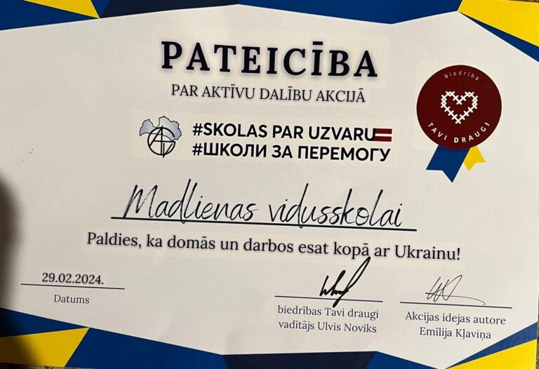 No 1. līdz 9. februārim Madlienas vidusskolas skolēni, skolas darbinieki piedalījās akcijā “Skolas par uzvaru”, kuras ietvaros vāca ziedojumus Ukrainas atbalstam. Skolēni un skolas darbinieki aktīvi iesaistījās un ziedoja gan pārtikas, gan sadzīves preces Ukrainas…