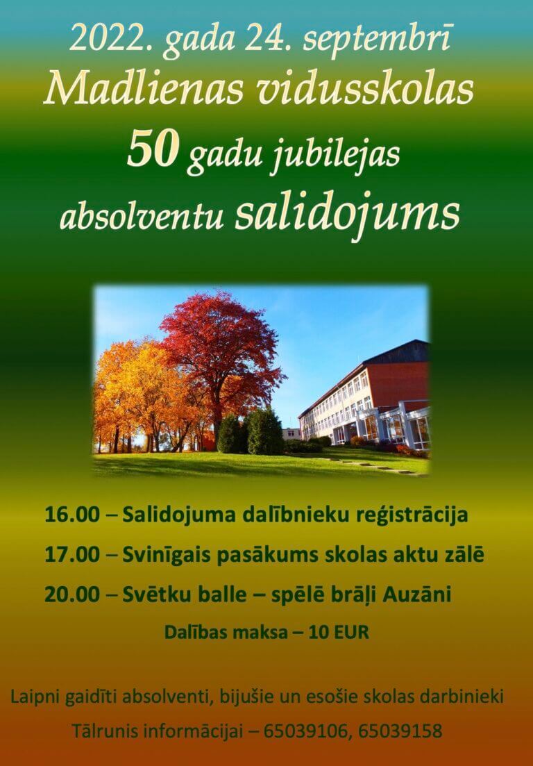 2022. gada 24. septembrī Madlienas vidusskolas 50 gadu jubilejas absolventu salidojums. 16.00 – Salidojuma dalībnieku reģistrācija17.00 – Svinīgais pasākums skolas aktu zālē20.00 – Svētku balle – spēlē brāļi Auzāni Dalības maksa – 10 EUR Laipni…