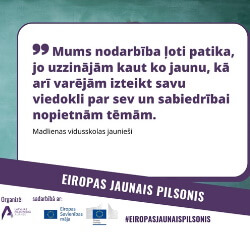 Madlienas vidusskolas 7. klases skolēni piedalās Latvijas Pilsoniskās alianses projekta konkursā: Eiropas Jaunais Pilsonis. Konkursa mērķis ir: izglītot Latvijas skolu skolēnus par Eiropas Savienības (ES) jautājumiem, sniegtajām iespējām un Eiropas pilsoņu tiesībām; veicināt jauniešu izpratni…